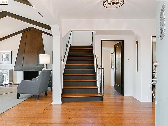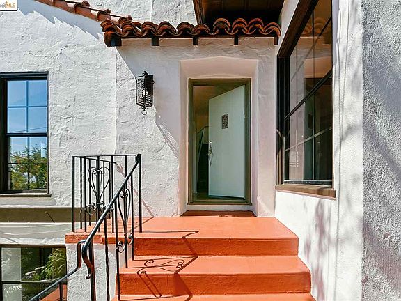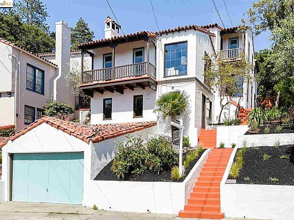 This stunning Mediterranean sits high above the street, enjoying bay views and sunsets. Features a grand formal living room with vaulted wood beam ceilings and a tile fireplace adorned with a copper hood. A formal dining room leads you into an updated, sunny eat-in kitchen that opens out to a private slate patio and manicured side lawn. An updated full bath can also be found on the main level. Upstairs you'll find a spacious master bedroom ensuite with original bath and a private balcony. The second bedroom also is an ensuite, with original bath. The two bedrooms share a lovely sun room -- wonderful retreat for reading, office, or a play room. The lower level offers a family room with fireplace, full bath and kitchenette -- ideal for au-pairs, game room, or rental with separate entrance. An added bonus is the long, side driveway that levels in to the house for convenient access.