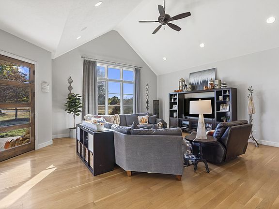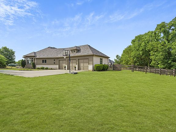 Meticulously maintained HOME, pleasantly situated on approximately 5.2 acres in the highly sought after, equestrian friendly, The Bluffs At Riverside, gated community in Ozark, MO. This stunning HOME incorporates a well thought out, flowing and modern architectural floor plan that is open, spacious and includes 3 bedrooms, 2.5 baths, and an over-sized 3 car garage. Even more, there are three distinct living areas to be enjoyed, which includes a basement space that's suitable for a wide variety of family activities. This charming HOME boasts many eye catching elements, such as, beautiful hardwood flooring, new carpet in the bedrooms and basement, tile, granite countertops, a double gas fireplace, fashionable lighting throughout, a central vac system, new interior and exterior paint, cathedral ceiling in the main living space/great room, a granite servery in the formal dining room, as well as, a spacious laundry room that includes a tremendous array of cabinets and drawers for a variety of storage solutions. The bedrooms in this HOME are very roomy and the master bath displays a large walk in shower, walk-in closet and double sink vanity. Also worth noting is the vast amounts of natural lighting that cascades throughout this gorgeous HOME. The gourmet kitchen design in this spectacular HOME is spacious, functional and features a beautiful large island, pendant lighting, custom Alder cabinets, granite countertops, an under mount sink, and high-end stainless steel appliances, that include: a 48'' wide KitchenAid refrigerator, a Viking gas stove and cooktop, GE Monogram oven, and a Whirlpool microwave and dishwasher. The outdoor space of this HOME is expansive and highlighted by beautiful trees, and an abundance of landscaping. Additionally, the backyard is fenced-in, which makes for the ''perfect'' place for kids to play and pets to roam. It also features a large back patio area with a beautiful pergola. The outdoor area of this delightful HOME is