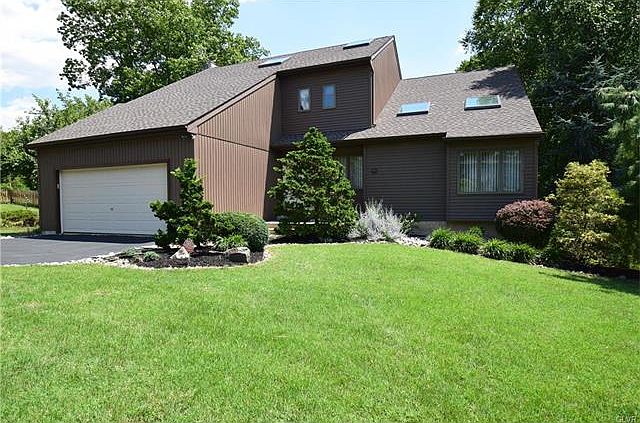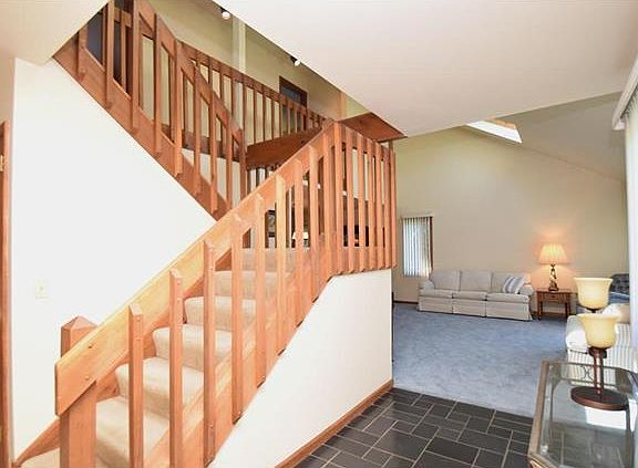 Contemporary beauty in pristine condition! This immaculate 4 BR 2.5 bath home on manicured grounds offers perfect comfort for living & entertaining with an open, flowing layout & multi-tiered deck leading out to a huge private yard. A voluminous light-filled living room with vaulted ceiling & skylights opens to the gracious dining room for seamless hosting. The large sunny kitchen is a chef???s delight & favorite gathering spot with plentiful counter & cabinet space. Enjoy casual fare in the breakfast room with a pantry closet & French doors to peaceful deck. Relax in the charming sunken family room centered by a gas fireplace with brick surround. Ascend the open wood staircase to a loft-like landing, beyond which 4 spacious bedrooms await including the huge vaulted master suite with a built-in vanity/dressing area & private sky-lit bath with a deep soaking tub, walk-in shower, heated floors. Other highlights include a full walk-out basement with laundry & soothing hot tub. NEW ROOF 2014