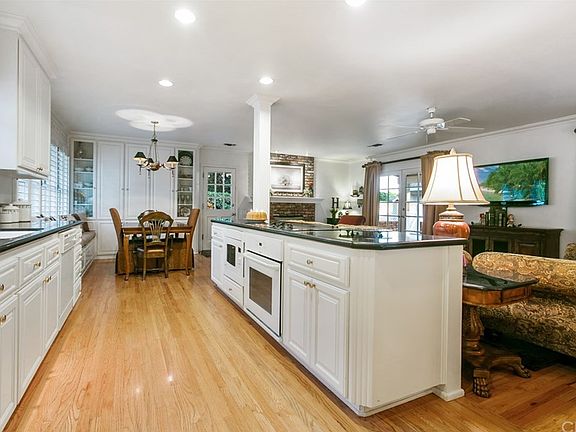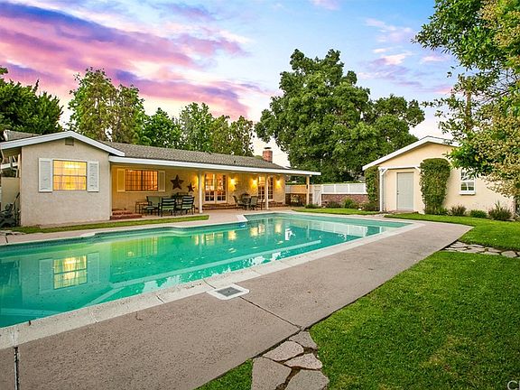 BEAUTIFULLY REMODELED SINGLE STORY POOL HOME WITH A TRUE OPEN CONCEPT FLOOR PLAN. Stunning curb appeal offers a green lawn, mature trees, a brick walkway w/lighting, brick steps leading to a covered front patio. The home also has a brick skirting on the front as well as a planter w/colorful flowers & fresh wood bark. A long driveway leads to a detached garage w/secure entry into the backyard. A custom front door w/side panels & glass inserts opens to an entryway w/original hardwood floors & crown molding. Family room is completely open letting in plenty of natural lighting, crown molding & two sets of french doors overlooking the backyard. A floor to ceiling brick fireplace w/wood mantel offers a cozy place to relax. Kitchen features classic white cabinetry, granite countertops, white appliances, an island w/built-in oven & microwave overlooking the family room, a dining room w/a chandelier, built-in seating, a built-in china cabinet & windows w/plantation shutters looking over front yard. Master bedroom w/carpeted floors, a ceiling fan, window w/drapery, spacious closet & direct access to master bath. Master bath w/ tiled floors, vanity, custom walk-in shower, laundry center w/cabinetry, sink & access to the backyard. Two additional bedrooms w/ceiling fans & wood shutters. Remodeled guest bath w/tiled floors, vanity w/tiled counters & shower/tub. Manicured backyard w/a sparkling pool, covered patio w/exposed beam ceilings, a green lawn, mature trees & a tiered grass area.
