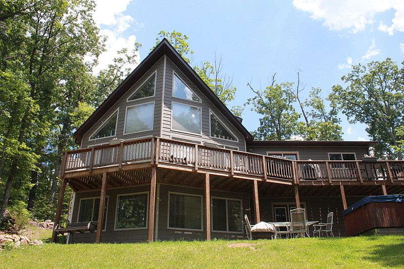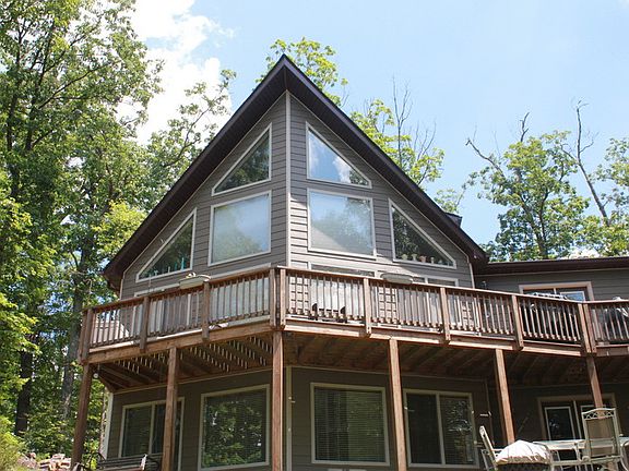 Set on a lovely landscaped and wooded 1 acre lot in Shenandoah Farms a one owner custom prow front chalet built by LV construction in 2010. The Western view is of mountains and seasonal river views. There are four private river access points available to Shenandoah Farms residents. Canoe, kayak, tube and fish, it is only minutes to the river. The house, garage and garden shed are sided with Hardi Plank which has fire resistant and insect resistant qualities. All appliances are upgraded and include Samsung, Jenn air and Bosch. Granite counters are in the kitchen and two of the bathrooms. The glass and stone backsplash complements the kitchen which also has under cabinet lighting. A wood burning fireplace surrounded with granite is in the open kitchen dining area. Recently refinished hardwood floors are throughout the main floor. There are custom cellular shades on windows for energy efficiency including two that are remote control. The upstairs master bedroom is carpeted and has a large walk in closet fitted with Ikea organizational items. The other two bedrooms have large double door closets. The master bath has a separate shower and soaking tub. All three bathrooms have natural stone floors with custom showers of natural stone, glass or tile. The finished basement has a pool table, TV area, office, built in wine rack, built in wine glass holder, wet bar and 2 separate storage areas one of which has a utility sink. The floor of the basement is all porcelain tile. Just outside of the walkout basement is the hot tub and fish pond. The deck runs around three sides of the house, perfect for watching the sunset. The detached 2 1/2 car garage has 50 amp service running to it and was built to accommodate a lift. Two pellet stoves, one on the main floor and one in the basement can heat the whole house and offer an alternative heat source. There is a water conditioning system that accommodates the whole house. The separate garden shed is 8' x 12' and is perfect for mowers and gardening equipment.