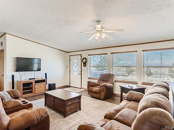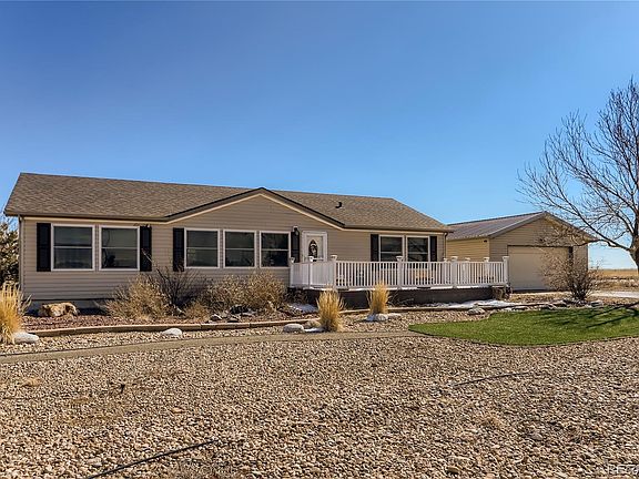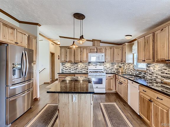 This 4 bed 3 bath Ranch style home with a finished basement is situated on 2.84 acres. Take in mountain views from the front porch as you enter. A large living room flows into an open concept kitchen that boasts plenty of space with gorgeous cabinets, granite counters, under cabinet lighting, and free standing island. The durable vinyl flooring in the main room and kitchen expands down the stairs into the basement where the walls are wrapped in Blue Stain Pine Wainscoting. Downstairs there is a bedroom, bathroom, large family room, and an unfinished storage space that could be a 5th conforming bedroom. The warm wood pellet stove and pool table are included. Beautiful landscaping and expansive sprinkler system to every tree, bush, and garden bed with Colorado Native River Rock surrounding the garden and home. Two large composite decks and a stamped concrete patio with fire pit are perfect for entertaining. The oversized detached 2 car garage next to the home has one 240v outlet. The 40x70 Pole Barn / Shop is a dream for any car enthusiast, it includes a car lift, three overhead garage doors, and two 240v outlets. Dog kennel and chicken coop are ready for pets.