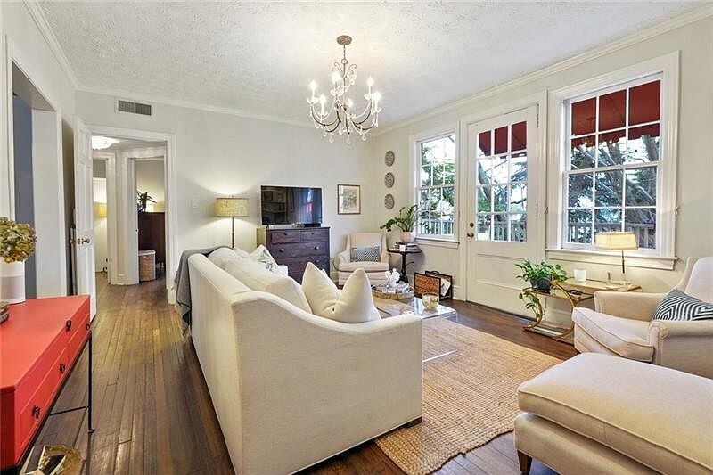 Live in one of Atlanta's most beautifully landscaped property, tons of character and charm. Peachtree Commons is on the Historic Registry. This top floor end unit has been recently updated with refinished hardwood floors, paint, new vanity in bath, light fixtures. Charm and character exude in this 2 bedroom, one bath condominium. Enjoy your spacious living area with tons of natural light. Separate dining ares or potential office space. Relax on your terrace surrounded by beautiful treetops, lush landscaping. Galley kitchen with solid countertops, stainless appliances, open shelving.Generous dining room with wall of windows. Roomy master bedroom with 2 closets. Amazing location, walk to restaurants, belt line, Bobby Jones golf course. Roof on building replaced July 2019, HVAC system 6 years old. 54 units and all unique. HOA includes internet and water. Community features a Fire pit area and Koi pond.