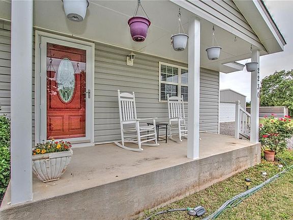 This home was totally remodeled in 2009 with new vinyl siding, paint, flooring, etc. Roof is new summer 2020 and all outside facia and boards were painted 2020. Nice storm cellar in fenced back yard. . Nice shop shop/garage has an area for tool storage, and an addition for storage of lawn mowers. Also an additional building is there for more storage area. New pump in well, and new pressure tank about a year ago. This is a wonderful home with nice big front porch to sit and watch the world go by. The land is just a little under 1 acre and goes from the road to the east to just past the storage building on the west side.