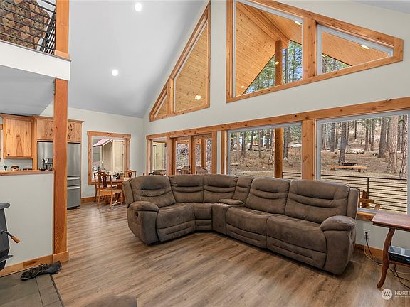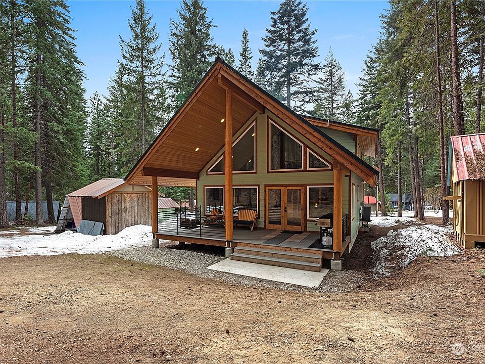 Almost new & incredibly well done Ponderosa cabin on a spectacular lot! You'll love the luxurious LVP flooring, soaring ceilings, & custom rustic hickory cabinets. Enjoy views of the woods on the covered back porch. Backing to a greenbelt & trails, this home offers peace & privacy. The pillars are crafted from reclaimed trees on the property, adding to the home's unique charm. Featuring extras like craftsman style moulding, walk-in master closet, large pantry & comm amenities like river access & pool, this home has it all! Floorplan: master bed/bath & loft up, living, dining, kitchen, 3/4 bath, utility, & bedroom down. Two 8 x 12 sheds & A-frame for storage. Open to selling mostly furnished. Don’t miss out on the opportunity!