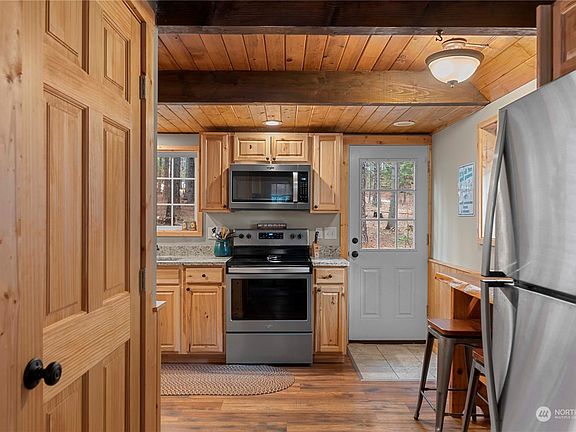Dream home or weekend getaway! Community pool, trails and beach access. This adorable cabin has every amenity you could imagine. Two loft bedrooms, a 3/4 bath, and a 1/2 bath. The main floor has been remodeled from the studs out including electrical and plumbing. Gorgeous pine ceilings with wood accent beams. Pine wainscoting, engineered wood floors and all new baths. Great kitchen with new cabinets, granite countertops and stainless steel appliances. Charming covered front porch and very nice Trex deck out the back door surrounded by open space. Sellers are open to selling mostly furnished!