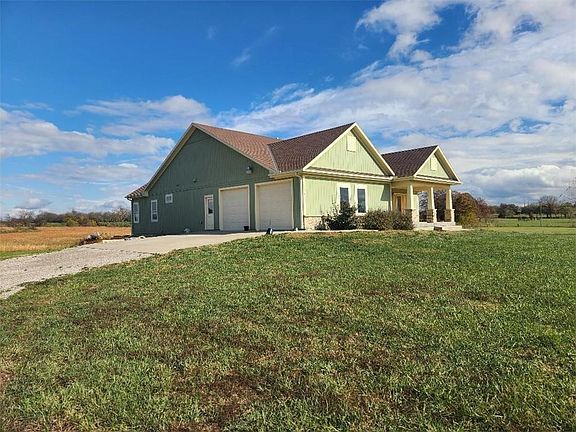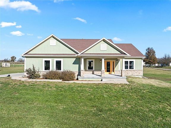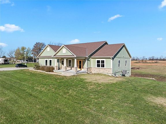 Custom built 2468' square foot ranch on 8.6 acres. Awesome open concept floor plan w/ 9' walls. Entry into dining area, beautiful kitchen w/ large island leads into great room w/ stacked stone fireplace. Great room patio door leads to covered patio. Huge primary suite 25x15 with gigantic walk in closet and 6x8 walk in shower. Split bedroom floorplan with secondary bedrooms on other side of house. Walk out lower level w/ 9' walls is ready to finish. Plumbed for bath and has egress window. 2x6 outside wall construction and on natural gas.