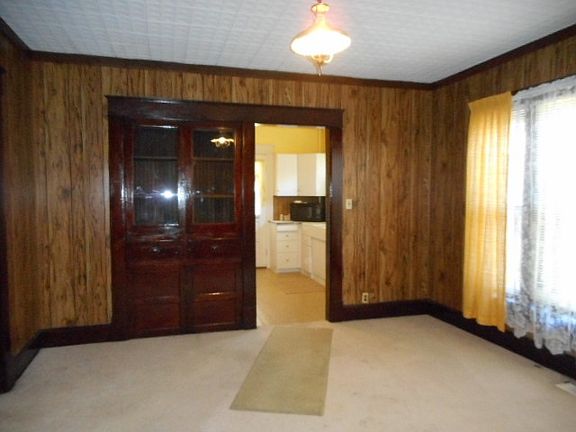This home has had great care over the years and you will see this when you walk in to the home. Home features a living room with antique mantel fireplace, a formal dining room with built-in china cabinet, kitchen has a corner built-in china cabinet. 2 bedrooms on main level and as huge finished dorm room on the upper level. Basement for storage. Has a great front porch for a swing, fenced back yard with a covered deck area off the back door. A detached garage, & carport. Home has newer vinyl siding, and is immaculate.