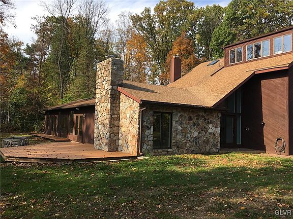 Spacious Contemporary Home nestled on a 2.85 acre secluded, mature wooded lot. 2-Story all glass entry overlooks an open staircase and 43' x 23' pool area with indoor pool and 8 person Hot Tub. The pool room also features solid wood ceiling, skylights and multiple French double doors to a surrounding boardwalk deck. The Quaker-Maid kitchen with its own double French doors to the outside has a center island with Jen-Air cooktop and double oven, granite countertops, glass tile backsplash, desk and wine rack. There is a large Family Room next to kitchen with tile floor, wood stove and its own outside French doors to deck. 4-7 Bedrooms total with 2 Full Baths & 3 - 1/2 baths. Spiral staircase with roof dome sky light and second standard staircase to a bright, fully windowed Third Floor 2 room Master Suite. Open design Master Bath with large walk-in white marble shower, pebble floor with window and Porcline tile floor. Parkland Schools / North Whitehall Twp.