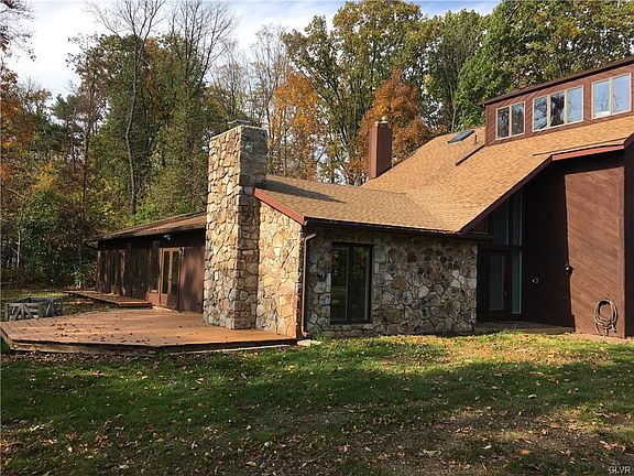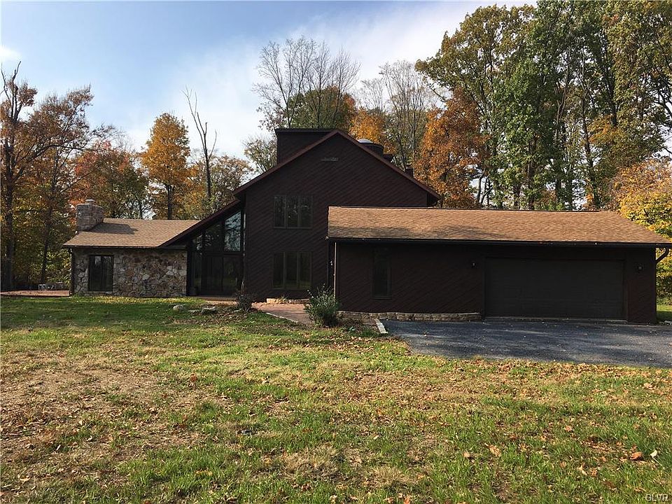 Spacious Contemporary Home nestled on a 2.85 acre secluded, mature wooded lot. 2-Story all glass entry overlooks an open staircase and 43' x 23' pool area with indoor pool and 8 person Hot Tub. The pool room also features solid wood ceiling, skylights and multiple French double doors to a surrounding boardwalk deck. The Quaker-Maid kitchen with its own double French doors to the outside has a center island with Jen-Air cooktop and double oven, granite countertops, glass tile backsplash, desk and wine rack. There is a large Family Room next to kitchen with tile floor, wood stove and its own outside French doors to deck. 4-7 Bedrooms total with 2 Full Baths & 3 - 1/2 baths. Spiral staircase with roof dome sky light and second standard staircase to a bright, fully windowed Third Floor 2 room Master Suite. Open design Master Bath with large walk-in white marble shower, pebble floor with window and Porcline tile floor. Parkland Schools / North Whitehall Twp.