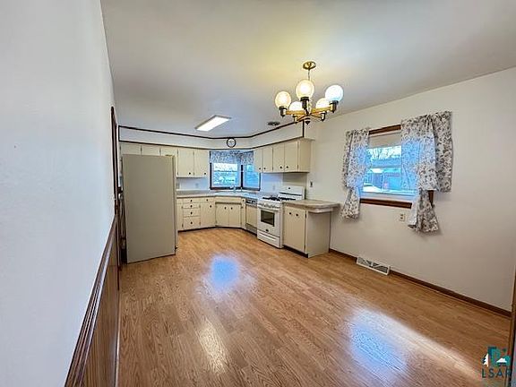 Charming ranch-style home in Cloquet! This 3-bedroom, 2-bathroom home offers a spacious layout with an open kitchen and dining area featuring painted cabinets. The cozy living room comes with a gas fireplace, perfect for those chilly evenings. Three bedrooms are conveniently located on the main floor, including one with a sliding glass door that leads to a private deck overlooking the backyard. The semi-finished basement includes a large family room with tile floors, a bar, and a wood-burning fireplace, offering great potential for entertainment or relaxation. There's also a room in the basement that could easily be converted into a bedroom with the addition of an egress window, plus a 3/4 bath. Recent updates include a new hot water heater, sump pump, some windows, roof, flooring, blacktop driveway, and furnace. Plus, enjoy the additional space in the 2-car detached garage with plenty of room for storage and a workshop area. Don’t miss out on this well-maintained home—schedule your showing today! Electric: $50/mo average Water/Sewer: $48/average for 2-person household, $82/mo average for 4-person household Gas: MN Energy