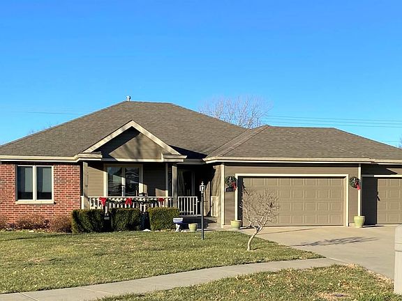 3 Bedroom, 2 bath, Ranch, 3 Car Garage in Shawnee Heights School District. Open floor plan, Livingroom has 9' ceiling, fireplace; diningroom and kitchen have hardwood flooring, many cabinets, breakfast bar, stainless appliances; separate pantry, mainfloor laundry with stainless washer & dryer; large master suite w/coffered ceiling, doublesinks, & walk-in closet. Full basement: partially finished 40' x 16' with egress windows, ready to finish, plenty of storage with build in shelving. Enclosed back porch 8' x 20'; out building 8' x 10; and full, privacy fenced back yard.