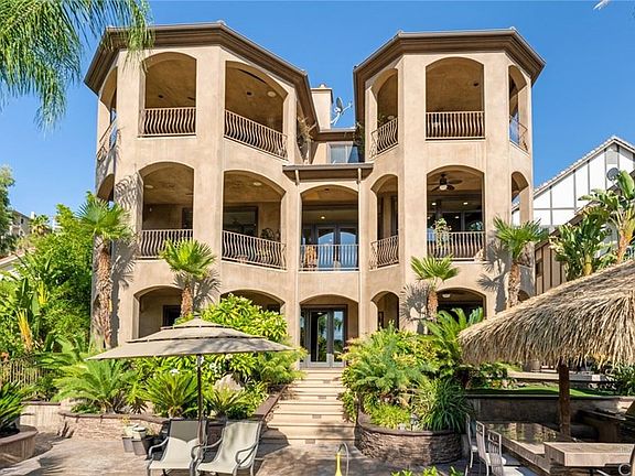 This is a spectacular 3 story lake front home on Canyon Lake's "Million Dollar Mile" with a lake view from every level. You enter through exquisite double doors into an elegant foyer with a soaring 24' ceiling into 7,360 square feet of luxury. The main level has an open floorplan which includes a full-length deck, formal living room, formal dining room, family room, gourmet kitchen with a large island, walk in pantry and an en suite bedroom with walk in closet. All 4 bedrooms have walk in closets. A curved staircase or the elevator takes you to the 3rd floor. There you'll find an exquisite master retreat with 2-sided fireplace, large walk-in closet and a dream bathroom. There are 2 additional en suite bedrooms with balconies. Also, an oversized laundry room. There are a total of 4 balconies in the home. The lower level offers a large recreation room with wet bar, a very large office and an exercise room and 3/4 bath. Double French doors take you to an inviting patio. The backyard is a lush tropical paradise which includes an outdoor kitchen, spa, gorgeous swimming pool with waterfalls, grotto and swim up bar. There are over 50 palm trees and many flowering bushes all leading to a beach area with fire pit, 60' of waterfront and a covered boat dock with a Hydro lift. There is a motor home garage, golf cart garage and a 2-car garage. Plenty of storage for all your lake toys. This home must be seen to appreciate all the elegant features. Too many to list. There is also solar and propane. Come to prestigious Canyon Lake and view this amazing property in a community called "A Little Bit of Paradise".