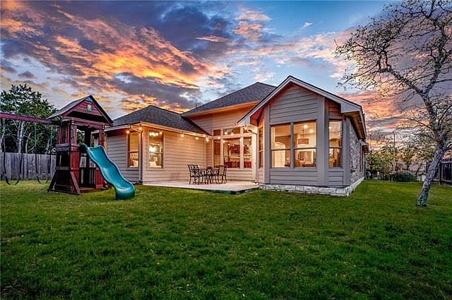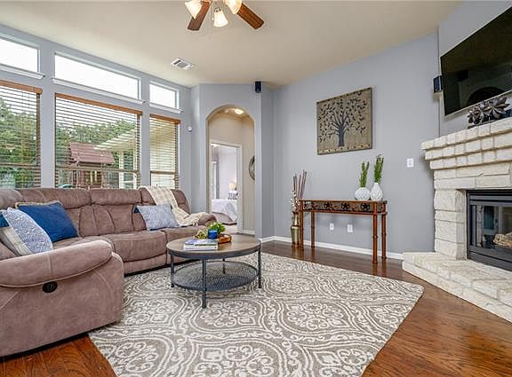 Charming single story home has upgraded touches throughout this desirable floor plan. Double vanities in the guest bath and large additional bedrooms, multiple living spaces that you can customize, open concept living and kitchen area with central island and breakfast area. Large windows open this space into the backyard patio with upgraded string lighting and private access to greenbelt. Master suite boasts high ceilings, french doors into the master bath with double vanities and a walk-in closet.