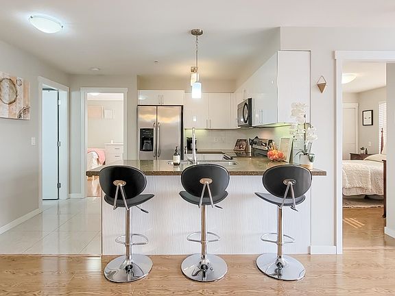 Here's your chance to own at 223 North! Close to anything you would need, this perfect package is situated within walking distance of shopping, parks, recreation, transit (West Coast Express) and schools. This bright two bedroom & two bath home features a functional layout with quartz countertops, soft closing cabinets, stainless steel appliances, and porcelain tiles. The 860 sq ft corner unit is spacious and well-situated on the south-facing, quiet side of the building. The sunny balcony boasts peekaboo views of the Fraser River and Mount Baker. This very well-maintained property comes with underground parking as well as bike storage, allows long-term rentals and pets!