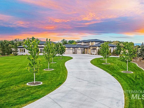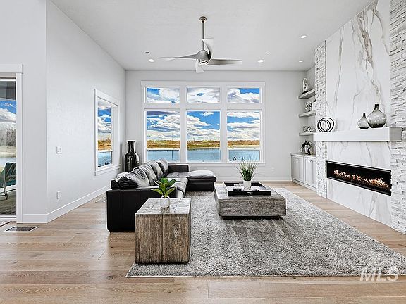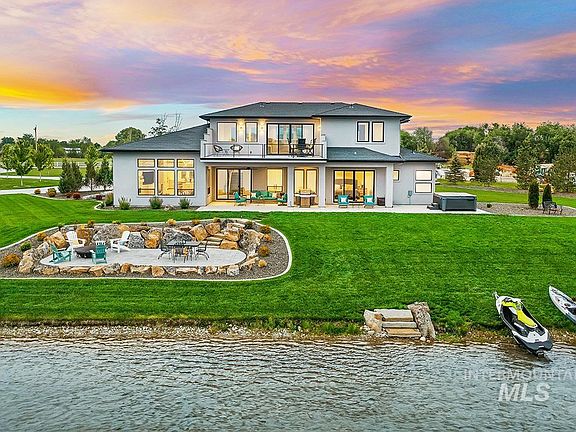 The ultimate Idaho luxury lifestyle experience awaits on 3+ acres of waterfront bliss in Leighton Lake Estates. The summer months bring out the vibrant best in this home— an ideal time to experience its unique blend of tranquility and adventure. This setting is a crystalline oasis in the countryside, set on one of the few residential lakes that allow motorized watercraft (launch your jet skis right from the backyard). It’s perfectly suited for all the recreational toys, with a remarkable 7-car garage set-up, including a true 50’ long RV garage. Proudly poised beyond a sequestered tree-lined drive, this striking Modern Prairie residence was designed and crafted as the builder’s private residence. Inspiring ceiling heights and walls of windows draw the eye to the water views, as the eastern sun pours in and casts a magnificent glow indoors. Unique textures and neutral tones create a sophisticated backdrop for everyday luxury and entertaining as beautiful, engineered wood floors effortlessly transcend spaces.