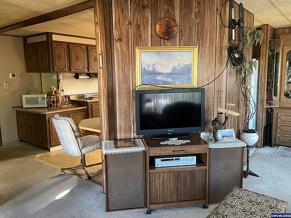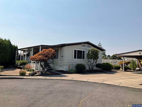 SENIOR COMMUNITY. Very nice, and well maintained MFG in a quiet Cul De Sac. Double Carport. Room for 4 cars. Large yard fenced on one side. New vinyl Low E windows through out. Completely weatherized top to bottom by Willamette Valley Community Weatherization. Newer Refer. Ductless heating and cooling system. Large master bath with soaking tub .Large covered front porch.