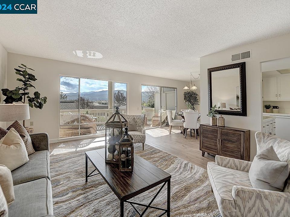 Enjoy the wonderful Sonoma model coop, boasting all-day natural light and panoramic views of Rossmoor's hills and valleys as well as a partial view of beautiful Mt. Diablo. This 2BD/1BA gem features custom closets, a new vanity, and a full-size Washer and Dryer in the bathroom. Revel in the outside-in feel, with custom plank vinyl flooring and baseboards throughout, complimented by new carpet and paint. Welcome to your serene retreat.