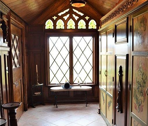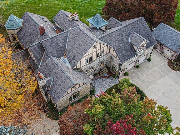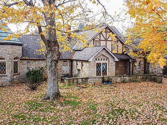 A real old-world classic tudor beauty showcases a blend of old and new construction combined with today's amenities. Inviting foyer features wall of closets and wood inlays. Engaging great room boasts massive stone fireplace, built-ins, sweeping ceilings, and access to stamped concrete patio. Impressive formal dining room presents large fireplace, built-in buffet, and creates the perfect space for entertaining. Adjacent cozy library w/fireplace and full bath. Gourmet kitchen offers SS appliances and built-in shelving. First floor master suite features WIC, glamour bath w/Jacuzzi tub, and 2 staircases (one to walk-in attic and one to LL). Guest bath conveniently located. The second floor consists of 4 bedrooms (2 en-suite and walk-in closets), main full bath, and an expansive bonus room/5th bdrm. Three staircases lead to lower level highlighting 2 wet bars, 2 frpls, full bath w/ walk-in shower, and a multitude of various multi-purpose rooms including wine room(s). Additional notables: extensive custom woodwork/craftsmanship, numerous additions throughout, five gas fireplaces, elevator (currently non-operable), two outbuildings...1 with a green house attached. Potential for a great workout space or art gallery. 3+ car attached heated garage. Circular drive. All stone exterior. Awe-inspiring views!