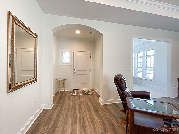 Elegantly designed home on premium lot in the quiet Courtyards at Wesley Chapel neighborhood. This home offers not only 2-bedrooms, 2-baths, but a sunny office with windows galore. Its open concept allows for seamless flow between kitchen, dining and living areas. Show stopper kitchen with an expansive island ideal for hosting, sleek Quartz countertops, and modern stainless-steel appliances. Step outside into a private fenced courtyard that backs to a treed greenbelt. It’s perfect for relaxing or entertaining with both open and covered patio areas. Extra bonus is its zero-entry option with wide doors, walk-in shower and no thresholds or steps. The Courtyards presents luxurious amenities including a clubhouse, a fitness center, pickleball courts, and a swimming pool. Residents can also enjoy the serene pond and walking paths within the community.Not quite 55, but thinking ahead? According to HOA, only 80% of homes have to have 1 person 55+ in residence. Short drive to Waxhaw, Waverly.