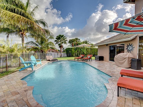 Amazing 5 bedrooms, 3.1 bathrooms, point lot, cul de sac, waterfront pool home at the desirable community of Boca Winds. This impressive home with great curb appeal features spacious and open floor plan. Beautiful updated kitchen with wood cabinets and stainless steel appliances. The family room opens to breathtaking lake views. Custom pool with travertine pool deck. Remodeled downstairs custom office its own bathroom extra added bonus of a Murphy bed. Enjoy the upstairs media room all ready for movies and popcorn. 3 car garage. Great West Boca location. Walk or bike to 3 ''A'' rated schools. Low HOA. Minutes from outdoor amphitheater, water park, nature center, tennis courts, boat ramp, pet park, and 27 hole golf course. Come and see this spectacular home!!
