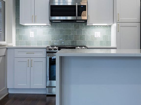 - Modern chef's kitchen featuring stainless steel appliances, sleek cabinetry, quartz countertops, and a stylish