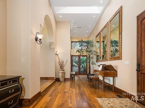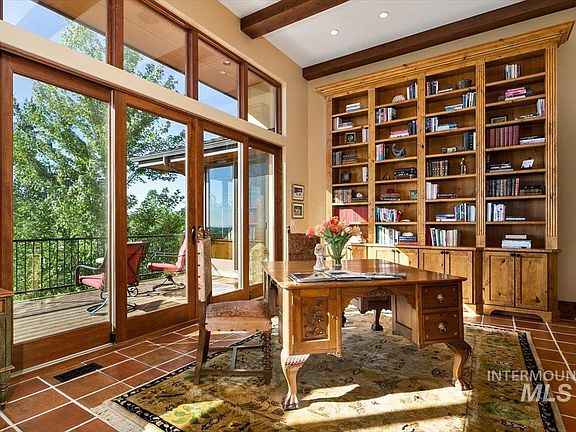 Perched high in Somerset above the Capitol dome, spectacular sunsets paint the sky above Camel's back in a vast panorama from the new deck of this stucco home on a private cul de sac. A main level primary suite with an oversized closet and dressing room shares the sunset views and additional deck access. Adjoining the master bath, a unique private courtyard with surround sound, is wired and plumbed for an outdoor shower and soaking tub. Mature trees shade a koi pond, waterfall and additional lower deck from a western exposure in this green oasis just above Hull’s Gulch. A California mission style home, it is a short walk from the HOA pool, with easy trail access, and a playground and tennis courts adjacent to the property. This warmly appointed destination with alder and iron accents boasts walls of windows featuring its ideal location and endless views.