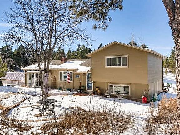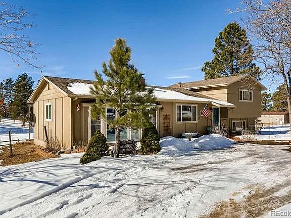 Beautifully updated horse property on over 2 acres with 2 barns, 2 chicken coops and large greenhouse! This home has 3 bedrooms and 2 baths with 2 living rooms each with a fireplace. Recently updated kitchen with quartz countertops, stainless steel appliances and solid maple cabinets with soft close drawers. Enjoy the outdoors and mountain views while riding your horses in your own outdoor arena. The close knit community makes this a truly special place to call home. Commute to Castle Rock in 20 minutes and just over 30 mins to the Denver Tech Center. Flagstone patio area with mature perennials surround the front of the home. You can truly have it all with this home; privacy, mountain views, acreage, horses, chickens, easy commuting area.