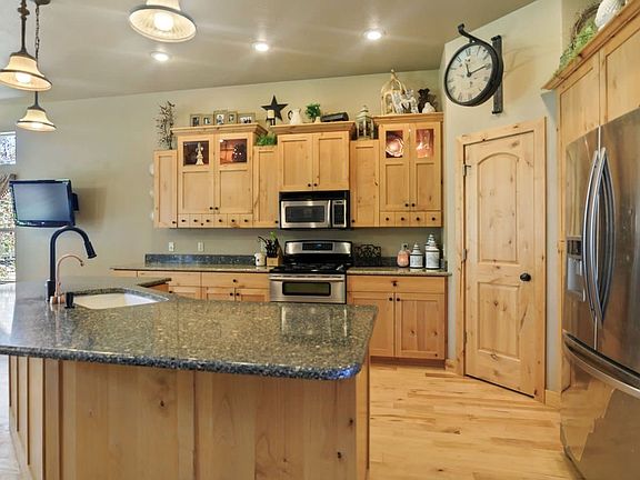 This custom home is nestled on a quiet cul de sac with BEAUTIFUL VIEWS and no HOA. This 4 bed 4 bath home has main floor living and ample storage throughout. Includes: theatre room, walk-out basement and kitchenette, jetted tub, refinished maple floors, new carpet in basement, full security system, dual-zone climate control, and dual water heaters. The garage is perfect for a boat, camper, or RV with 14-foot ceilings. Summer nights can be spent in the backyard with mature trees lining the fence!