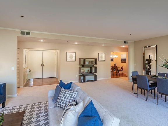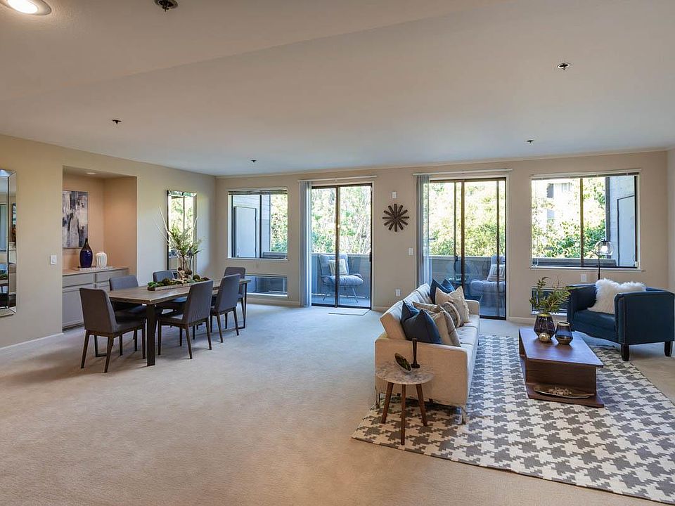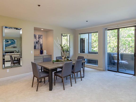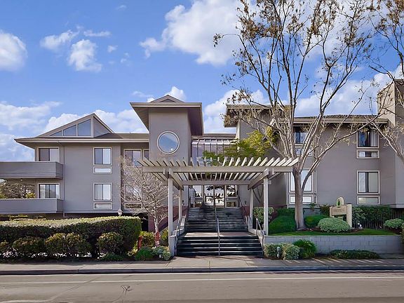 Spacious and open condominium on the edge of Los Altos next door to shopping and dining, including Peets and Starbucks. Well-appointed, two-story secure lobby entrance with solarium-style glass wall and clerestory windows for amazing natural light. Elevator access to location on the second level. Spacious living and dining room combination with carpet, built-in china storage and two sets of glass doors to the private balcony deck overlooking the garden courtyard. Updated kitchen with large casual dining area, painted cabinetry, and granite slab counters. Master bedroom suite with laminate wood floor, mirrored closet plus two additional closets and en suite bath with two separate vanities. Additional carpeted bedroom with mirrored closet and en suite bath. Gated garage parking for 3 cars. Community pool, spa, sauna and clubhouse. Adjacent to shopping and dining plus easy access to Highways 85 and 280 to all of Silicon Valley. Cupertino schools!