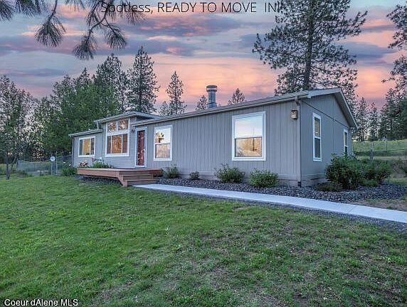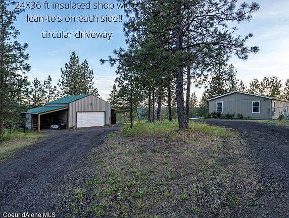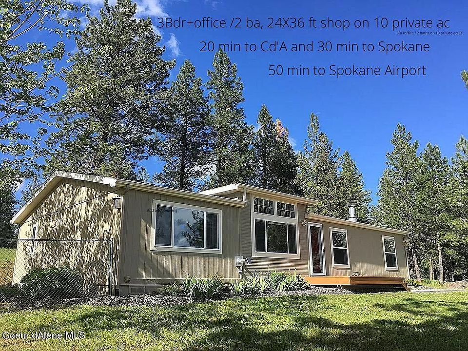 Ready to MOVE IN, one of the cleanest properties, inside and outside, recently REMODELED, 3BR + office, 2baths MH on 10 private acres, utmost privacy at dead end road. Set as REAL PROPERTY! No HOA or CCR's! Vaulted ceilings! The house has 3 SOURCES OF HEAT: pellet stove, wood fire place & forced air heat. Large SHOP (24x36) with lean-to's on both side! Established GARDEN with fruit trees and berries! This property gives you the opportunity to set up a MINIFARM, don't rely on buying from the local grocery! High speed Internet RED SPECTRUM! 3 ac fenced for horses! NEW vanities, W/D, water softener! NEW flooring: laundry & baths! NEW window trim and baseboard! Freshly PAINTED inside and out! 20 min to Coeur d'Alene, 30 min to Spokane! BREATHTAKING VIEWS, unique, one of a kind, private and secluded on a dead end road & in a cul-de-sac,all sitting on a PRIVATE, parklike 10 acre. SELLER ASSIST WITH SOME CLOSING COST ON ACCEPTABLE OFFER !