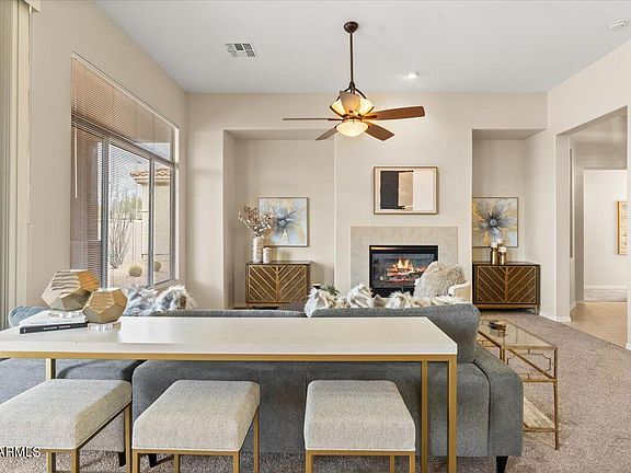 AVIANO! Cul-de-sac location. 2 suites (primary and junior) and a large bedroom/office/den and half bath. Toll Brothers exquisite home with an expansive family room, high volume ceilings and gas fireplace. Kitchen has granite counters, kitchen island, stainless steel appliances and tons of cabinets. Separate formal dining room also ideal as office or flex space. Primary bedroom features a jacuzzi tub & very large walk in closet. Newer carpet, recent paint interior & exterior, newer appliances & HVAC. Cul-de-sac property with natural desert wash to the side. Expansive desert landscape backyard. Enjoy the Aviano lifestyle! Clubhouse close by w/ resort pool, weight, gym, fitness, activities, tennis/pickleball, parks & so much more. Shopping, mall, restaurants, schools,101 & 51 all close by.