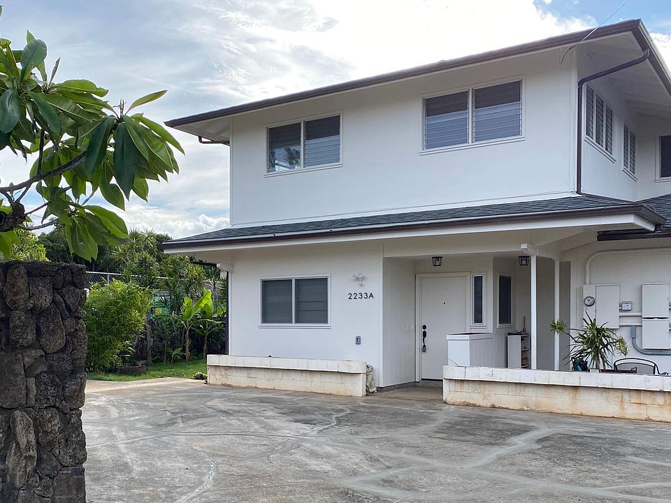 Preferred lower Manoa neighborhood. Recently renovated (2020) duplex home, available to rent starting March 19, 2022. $4,200/month. 2 uncovered parking spaces. New motorized driveway gate (being installed next week) and yard fencing provide enhanced security. Unbeatable location: 1 block from UH Manoa; 3-4 blocks from Mid-Pac and Punahou; Noelani school district; 1 minute drive to freeway. Three bedrooms and laundry are upstairs; downstairs room is ideal as guest bedroom / home office, or can be fourth bedroom. Features ceiling fans and Window A/C throughout house. Rent includes water and yard service; electricity is sub-metered and billed separately (avg ~$160/month for three-person family). Pet friendly for additional monthly fee. Features good neighbors and modest, shared yard; yard includes bonus storage shed. No Smoking. First month's rent plus one month security deposit required. Aloha, Alexa-