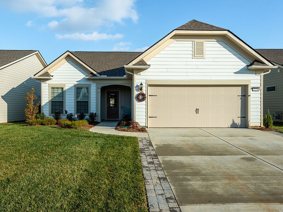 2020 construction of this Martin Ray plan in Southern Springs, a 55+ community. Lots of upgrades, including hardwood floors throughout home, upgraded cabinets and countertops, under cabinet lighting, and fireplace with blower. Garage has 4ft extension with walk up stairs to storage, and a utility sink. Fenced in yard with irrigation system, and HOA maintains yard. Beautiful blinds throughout and blinds in sunroom are remote controlled. Refrigerator conveys.
