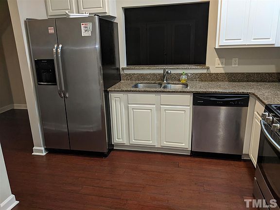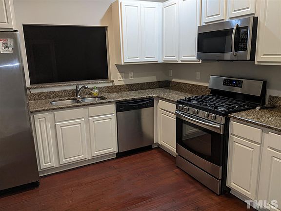 Terrific Townhome close to NC STATE & I40 & RTP. Perfect for first time home buyer or investors. Bay window in spacious kitchen with gas stove, granite counter tops, white cabinets, hardwood floors, large family room with corner gas fireplace & dining area.Fresh paint throughout.Private back deck with storage shed. Refrigerator, washer and dryer convey.