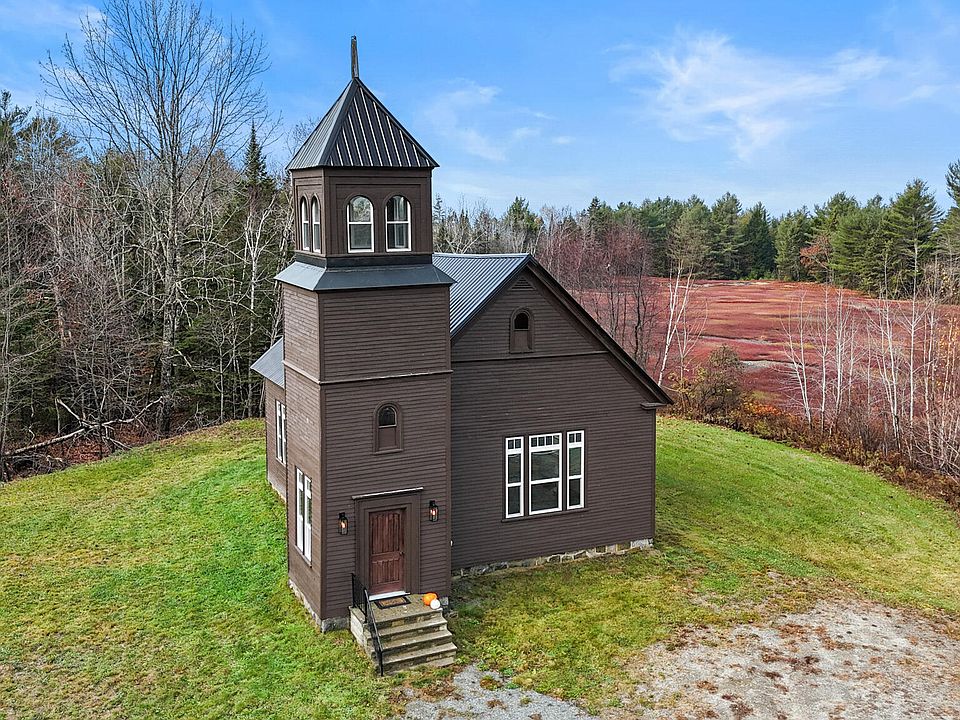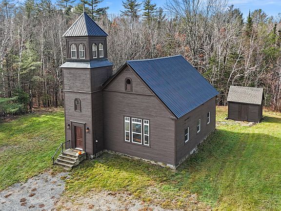 This historic building has been transformed into a studio-style home that beautifully blends original character with modern updates. The majority of the building was remodeled in 2023 using a mix of new and salvaged materials, it retains its unique charm while offering contemporary comforts. Although some renovations are still needed, completing the bell tower could enhance the space offering stunning views of the surrounding blueberry fields. Imagine a home office or reading nook at the very top. Property also features newer septic system and well. The location allows to remain as residential or commercial opportunities.