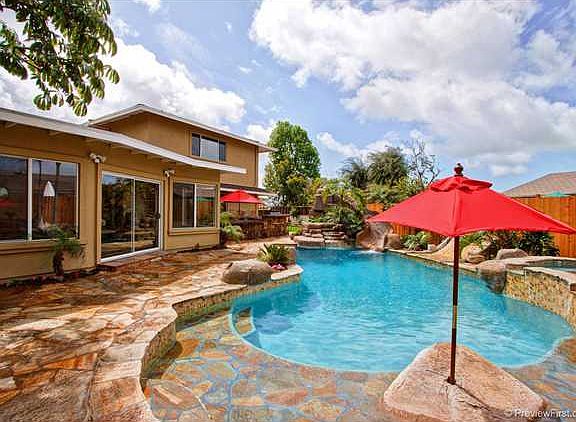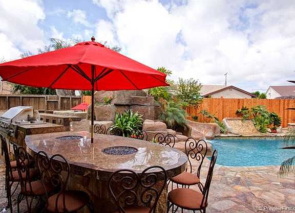 WOW! This home has it ALL! At the end of the cul de sac. Perfect for family & entertaining. Peek-A-Boo Views! Recently renovated with custom design features throughout. The open floor plan flows to the outdoor resort. Relax under the cabana, soak in the spa or slide into the pool. Play badminton or croquet on the lawn. Feast on homegrown fruits & vegetables from the garden. Prepare gourmet meals in either your indoor or outdoor kitchen both feature granite counter tops & stainless steel appliances.