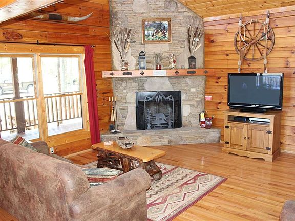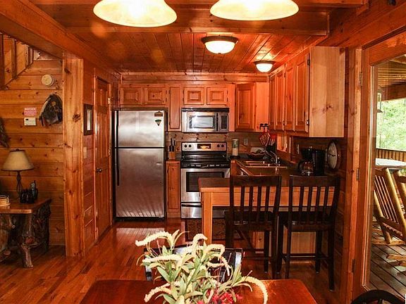 One of the most beautiful cabins in our area! This is an exceptionally cared for home with gleaming hardwood floors and walls, upscale furnishings, and so many great windows. It has all new staining on the exterior, and the interior has been freshly sanded and stained as well. The large, covered wrap around deck affords views of the outside and plenty of room for tables and sitting areas. Inside, there are unique touches that make this log home a real vacation "home". Comfortable furnishings, great kitchen, two bedrooms and baths and a big loft game area with extra bunks. Nice location close to Pigeon Forge, yet private enough to fell like you are getting away.