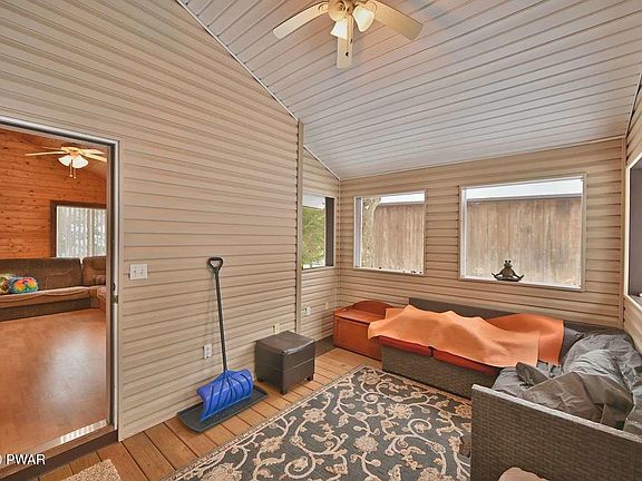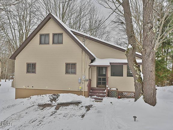 Chalet home in an amenity filled community in the Northern Poconos. Just a short walk to the ''North Beach''. The large windows and large deck face the rear of the wooded lot for added privacy. The home has vinyl siding, a beautiful screened in room, an extension on the side with beautiful knotty pine tongue and groove open to the main living room area. Get cozy near the brick fireplace with propane insert. There's a loft overlooking the living room that offers great views from the large chalet windows. The walk out finished lower level offers plenty of space for fun. There's also a 2nd bathroom and workshop area. The amenities include lakes, beaches, pools, clubhouse with restaurant and pub, golf course, ski hill, tennis, indoor recreation complex with tennis/fitness center
