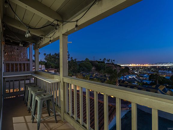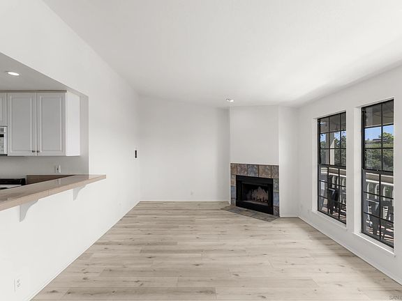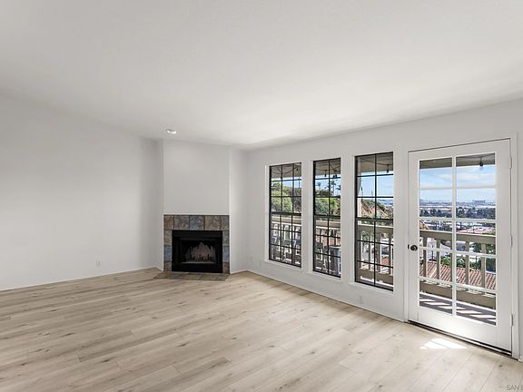 Showcasing impressive views from the highly desirable Mission Hills neighborhood, this beautifully updated top floor 2-bed, 2-bath condo is perched just above Old Town. This corner unit features sweeping views of the ocean, bay and downtown, with the bonus of SeaWorld fireworks, all enjoyed from the comfort of your private covered porch. Inside, you’ll find a freshly painted, thoughtfully designed space with a vaulted ceiling in living room, a skylight, and large windows that fill the home with natural light. Luxury vinyl plank flooring runs throughout, creating a seamless and modern feel. The open-concept kitchen offers ample cabinetry, a breakfast bar, and an easy flow into the living room with a cozy fireplace. Two generously sized bedrooms function as dual primaries, each offering great privacy and storage. One bathroom features a custom handmade vanity top. Enjoy resort-style living in a secure, gated community with premium amenities including a pool, hot tub, gym, BBQ area, and support for solar and EV charging station installations, subject to HOA approval. Additional highlights include in-unit laundry, two assigned garage parking spaces, and a private storage unit. HOA dues of $520/month include water, trash, pest control, exterior maintenance, and care of common areas, offering low-maintenance living. Just a short walk to Old Town’s restaurants and shops, and steps from the scenic trails of Presidio Park.