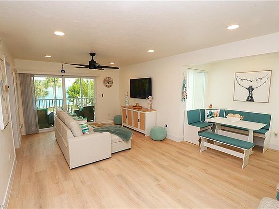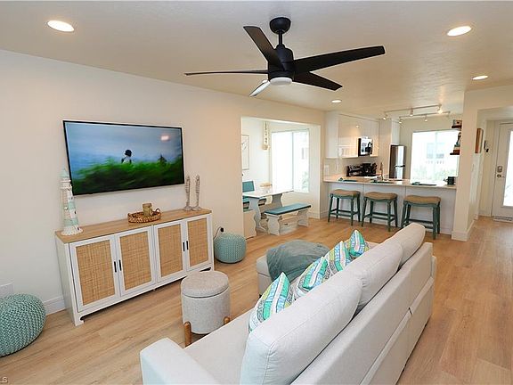 This beautifully remodeled 2-bedroom, 2-bath condo in Marco Island is the perfect seasonal retreat. With a fresh, light tropical design, the space feels inviting and relaxing from the moment you walk in. The unit features a private balcony that overlooks lush green space ideal for enjoying the cooler winter months with comfortable outdoor seating. Inside, the spacious living room offers a pull-out sofa and smart TV, perfect for relaxing or entertaining guests. The fully updated kitchen is a standout, featuring all-new stainless steel appliances, stunning countertops, modern cabinetry, and a stylish breakfast bar with comfortable barstool seating. Just off the kitchen, a thoughtfully designed dining nook maximizes space while adding a touch of elegance. The primary bedroom is filled with natural light, offers balcony access, and includes ample closet space. It connects to a beautifully renovated ensuite bathroom complete with a walk-in shower and sleek new vanity. The guest bedroom also features great light, a generous closet, and easy access to the second full bathroom, which includes a shower/tub combo and updated fixtures. In-unit laundry adds to your convenience. The entire complex has recently undergone a full renovation with a new facade, windows, and doors. Amenities include a heated pool and a large sundeck perfect for relaxing or socializing. Located near the main Publix shopping center, and close to a variety of restaurants, shops, and local attractions, this condo is a fantastic choice for your seasonal stay on Marco Island.