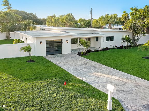 Completely remodeled mid-century modern block 3/2 with no HOA in a that is walking distance to the beach. The exterior of the home has a new paver driveway, new paver porch with summer kitchen, new pergola with string lights, the pergola has a 220v outlet for a hot tube, new vinyl fence, new six zone irrigation, Saint Augustine grass, fresh paint, new landscape lighting, impact windows, new custom garage, and new front door. The interior has original terrazzo throughout, fresh paint, new lighting, new fans, and new trim and doors. The kitchen has custom 42-inch cabinets, new appliance package, calcutta quartz counters, and custom backsplash. Both bathrooms have custom tile work, new vanities & toilets, & frameless glass showers. This home has it all, too much to list, Come see it yourself! yourself!
