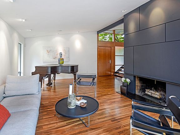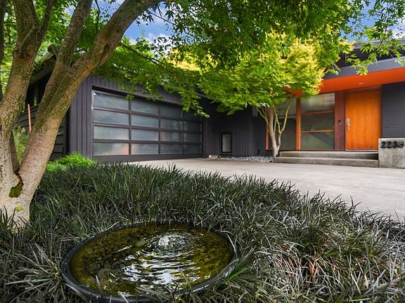 This timeless and iconic mid-century modern promises to impress with minimalist steel details throughout. Sophisticated open concept living is perfect for entertaining. A dramatic floor-to-ceiling fireplace surround anchors the living room. Step down the one-piece steel stairway to the dining room where windows soar to the vaulted ceiling and overlook a gorgeous and totally private, entertaining sized patio, with a verdant landscape. Indoor-outdoor living is the draw of this stately chefs kitchen with Miele appliances and a 15-foot island for a buffet setting that opens to the flowing backyard oasis. During the holidays you can host cookie-baking for the entire cookie exchange guest list. Tucked behind the kitchen, the media room/ library could be turned into a convenient guest room. As you reach the upper floor the office seems to float among the different levels of this home. All bedrooms and full baths are on this upper level and the master suite at the end of the hall overlooks lush greenery and features a double vanity bath with oversized shower. Lower level bonus room with extensive storage is currently being used as an office. Blocks to Madison Park shops, eateries, beach and parks; as well as easy freeway access.