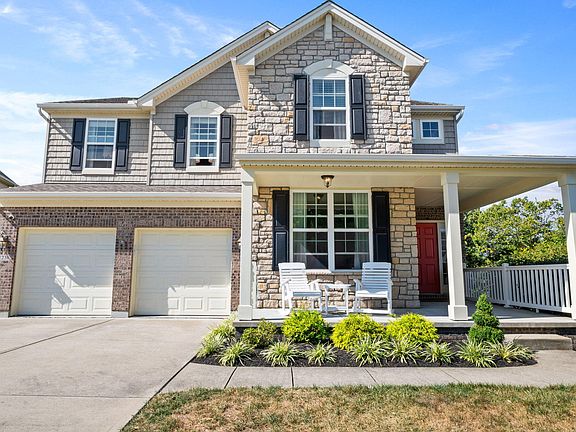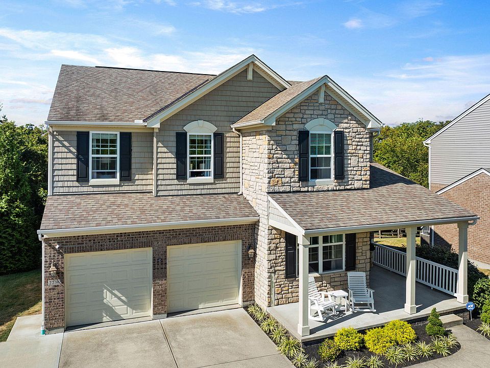Amazing home located in the sought-after Thornwilde community! This delightfully maintained residence features a spacious and thoughtfully designed layout that combines timeless style with everyday livability. A relaxing front porch sets the tone, leading into an inviting interior with a cozy sitting/living area, a lovely dining room & an impressive two-story great room filled with natural light and anchored by a comforting fireplace, also featuring a convenient side staircase with a second level overlook. The open-concept kitchen showcases a stunning island & effortless flow for both daily life & entertaining. Rich hardwood floors & tasteful details add warmth and character throughout. The finished lower level offers versatile space for a media room, home office, gym or additional bedroom, plus there's a full bathroom. This area walks out to a generous backyard with multiple outdoor living areas seamlessly blending indoor & outdoor spaces. Enjoy a wooded rear view offering privacy & a serene natural backdrop. Convenient to schools, shopping, dining, CVG Airport & just minutes to I-275. Community amenities include clubhouse, pool, tennis court & walking trail. Shows beautifully!