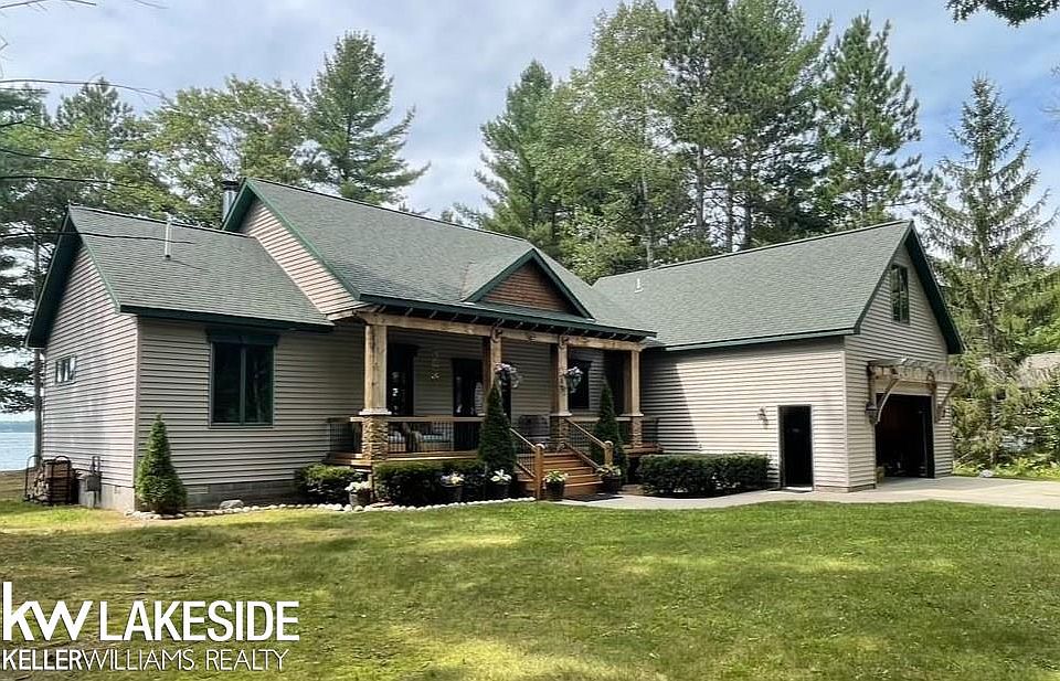RARE GENERATIONAL GEM ALL SEASON LAKEFRONT PROPERTY ON GOLDEN COAST OF EAST TWIN LAKE IN LEWISTON, MI Welcome to a once-in-a-lifetime opportunity! This exceptional property, a generational gem, graces the coveted few properties on the "Golden Coast" of East Twin Lake. Enjoy rare soft sandy beaches stretching gradually for 100 feet into the lake, providing a unique waterfront experience. The best breathtaking western views capture priceless sunsets in both summer and winter. PROPERTY FEATURES • 2,008 sq ft of knotty pine warm, fully furnished cabin-life living space • 3 bedrooms, 3 full bathrooms, and a knotty pine-finished loft with 5 beds • 1.26 acres of natural beauty featuring a tree-covered winding driveway to the house • Spectacular views enhanced by the lot's elevated position • 830-acre (5 miles in circumference) all sports lake with the renowned Lewiston Lodge accessible by boat • 100 ft of shoreline with a 90 ft Shore Crest dock included in price • Warm, friendly, helpful neighbors • Located within 1 mile of Grocery stores, pharmacies, restaurants, bars, famous Talley’s Log Cabin, hardware stores, antique shops, marinas, summertime, winter repair, and car wash • Easy access to hundreds of miles of ‘winter wonderland’ snowmobile and off-road trails, Ski Resorts downhill, cross country, wineries, and popular northern MI events. • 4 miles from the world-famous Garland Lodge and Resort, 4 golf courses and amenities CHARMING INTERIOR • Natural wood-burning fireplace with a beautiful stone finish to ceiling • Attached 24x24 insulated and knotty pine finished garage with an 14ft wide x 8’ high insulated garage door with 2 service doors • Detached 36x32 garage with two 16ft wide by 9ft tall insulated garage doors and a service door • Separate gas furnace in detached garage • Whole house Kenmore water filtration system and water softener • Granite countertops in kitchen, stone veneer wall, and tile flooring • Large covered front porch with 12’x12” full cedar timbers and stone bases • Pergola finishes over the front porch and over the attached garage door RECENT UPGRADES • New Furnace and Hot Water Tank (2021) • Re-insulated attic in 2022 • Professionally power-washed exterior in 2023 • Neatly finished crawl space OUTDOOR DELIGHTS: • Beautifully landscaped lakeside lot with tall limbed-up white pines for unobstructed lake views • Outdoor pathway leading to a beautiful bonfire pit for marshmallow roasting • Great 4th of July celebrations with amazing fireworks displays over the lake views Don't miss the chance to own one of the few "Golden Coast" properties on East Twin Lake. Owners are relocating out of state.