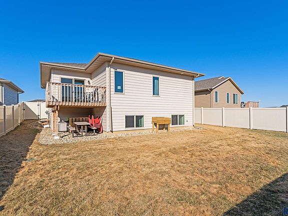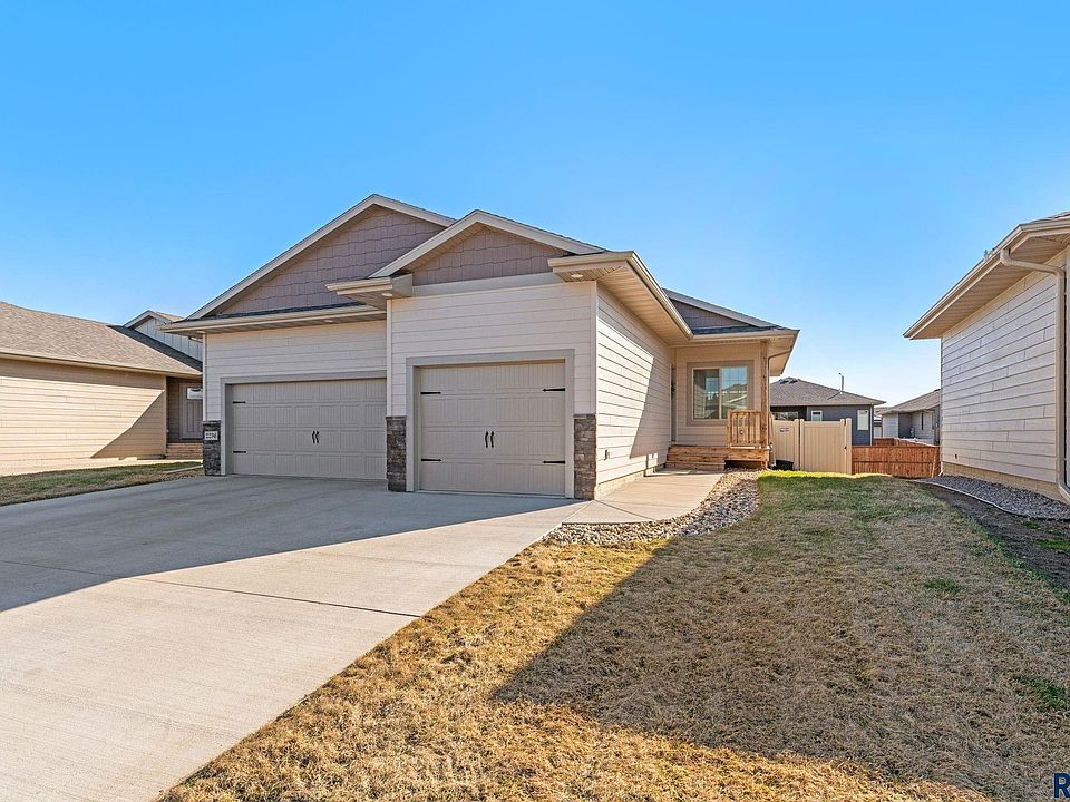 Introducing a stunning five bed, three bath ranch home located on the desirable west side of Sioux Falls. Built in 2022, this home flows with modern finishes and ample space that will have you loving coming home each day. The main floor features a spacious and airy open floor plan with a gourmet kitchen that includes a large island, new fixtures and S/S appliances. Enjoy dinners in the open dining room and time outside on the back deck that overlooks the fully fenced in back yard. To finish off the main, find 3 spacious bedrooms with walk-in closets including a well appointed primary suite where you'll enjoy a private bath and extra large closet. Check out the 2nd full bath and convenient M/F laundry room before heading downstairs to find a grand family room with electric fireplace, a large 3rd bath, and 2 more garden level bedrooms. This home features a brand new vinyl fence and water softener plus upgraded fixtures throughout. Top it all off with a nice 3 stall garage! Welcome home!