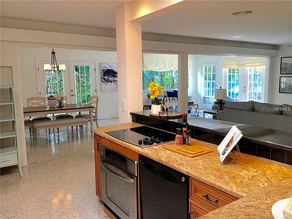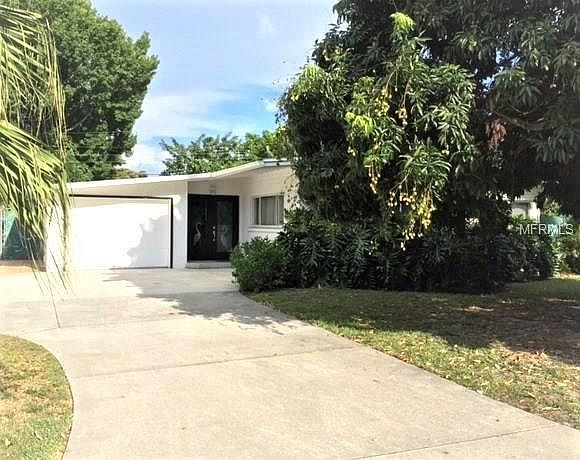 ACCEPTING BACK-UP CONTRACTS. Mid-Century modern beauty with recently refinished terrazzo floors throughout most of house. Great square footage, 1990 sq. ft, 3 bedrooms, 2 baths, 1 car garage. Inside, there is a bright open floor plan, oversized plate glass windows, French doors to canopied outdoor area, kitchen skylight, kitchen open to living areas. Family room has wood burning fireplace. Master and guest bedrooms are very spacious and the 3rd bedroom has ability to be a den as it opens into the living areas with folding doors, but easy to sheet rock back (it has a closet). Off the kitchen is an interior laundry room and a bonus room with exterior access and a large storage closet. The attached one car garage also has a large storage room. A very private backyard contains mature trees and plants and there is a prolific lychee nut tree in the front yard. Air conditioner and handler are 2012, roof in 2001. Lots of privacy plus natural light in this home and you can walk to Lucky's Market, Westgate Mall and a multitude of shops and restaurants. 5 miles to Siesta Beach. This will not last long.