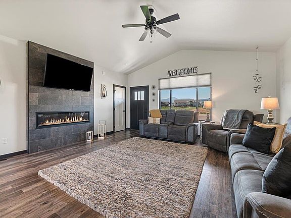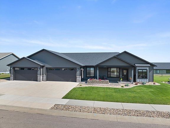 Listed by Tashi Braun, 605-641-3342, REMAX In The Hills. This four bedroom, two bath home is located in the beautiful Top Shelf Development. Amazing curb appeal and the beauty of Crow Peak welcomes you in to this modern one level living home. Step inside and find yourself surrounded with beautiful custom finishes throughout. The open concept floor plan greets you as you enter the large family room. There you will find vaulted ceilings and a beautiful gas fireplace. Great for entertaining, the kitchen offers wonderful quartz countertops, center island and high end appliances. You will love listening to music on the built in speaker system that continues outdoors to the stamped concrete patio. The spacious 1700 Sq Ft, 4+ stall, fully finished garage, is truly like another living space. The garage features epoxy floors, heat, in floor drain, overhead shelving and beautiful industrial cabinetry. Just off of the garage you will love the "BONUS ROOM". Tucked beneath the garage is a 381 Sq Ft room with endless possibilities! This one of a kind home is a must see and is waiting just for you!