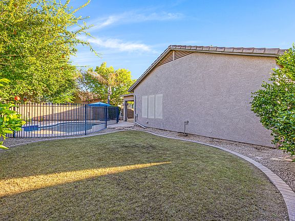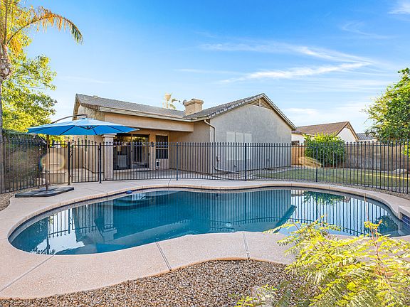 Step outside to your private retreat a resort-style backyard featuring a sparkling pool, covered patio, outdoor fireplace, and a lush grassy area ideal for gatherings or quiet enjoyment.
