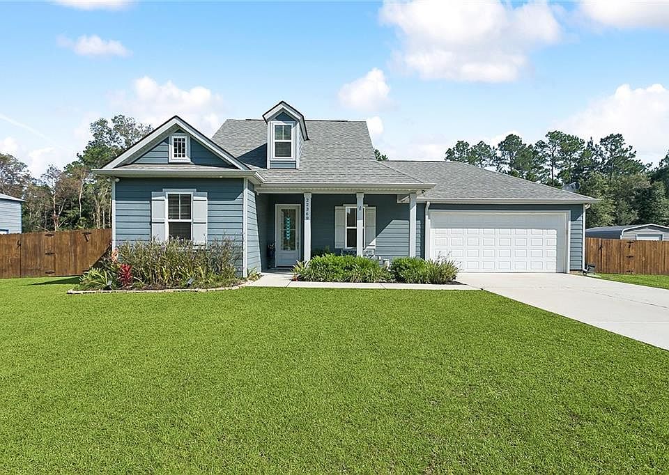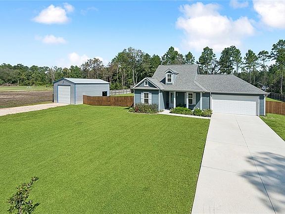 Modern coastal cottage vibes. MUST SEE to APPRECIATE This fresh well-appointed home has everything, built in May 2021. Totally fenced in property with three walk through gates and one drive in gate. Keeps everyone safe in the yard. Custom Plantation shutters in main living area and custom Plantation blinds in all bedrooms give a sleek finished feel. Open concept living with porcelain plank tile throughout. Large kitchen with plenty of storage and soft close drawers and cabinets. Built in drawer microwave, double 24” convection ovens, smooth glass cooktop. Quartz countertops throughout. 10’ ceilings make for an open spacious feel. Complete surround sound system with wall mount tv connections. Three large bedrooms with huge walk-in closet in master and spacious bathroom to match. Large walk-in pantry to store everything including your large countertop appliances to avoid clutter. ½ bath inside back porch door for easy access from pool. No wet floors through the house! Pool deck is travertine and virtually maintenance free. Pool has a heater/cooling system. Fabulous pool area and back porch/patio has an external speaker system and wall mount tv. Well and septic system. Well has a purifier filtering system. Home is total electric. Large laundry room with utility sink and room for freezer and crafts. Oversized double car garage with a workshop built in at back of garage (under roof) Both front and rear porches have tile floors. Covered electric outlets under the eaves on a separate switch for easy light decorating. Attic floored completely and easily accessible through the garage. Large metal building (35 x 25) for boat storage with 8’ side door and large roll up 12’ tall door for easy boat entrance. Slab floor has a drain to make washing inside easy